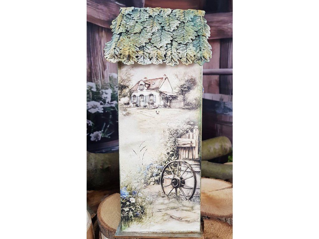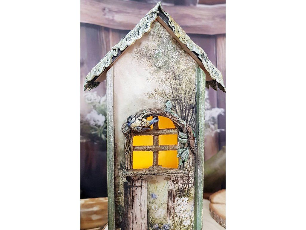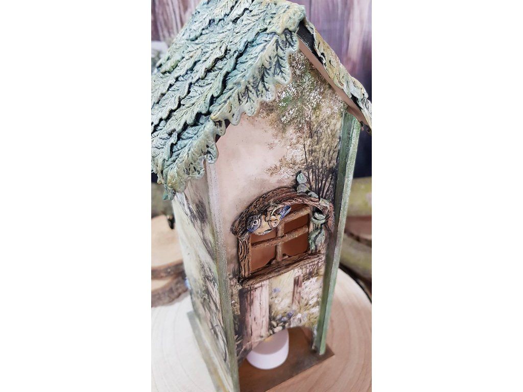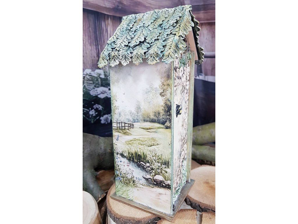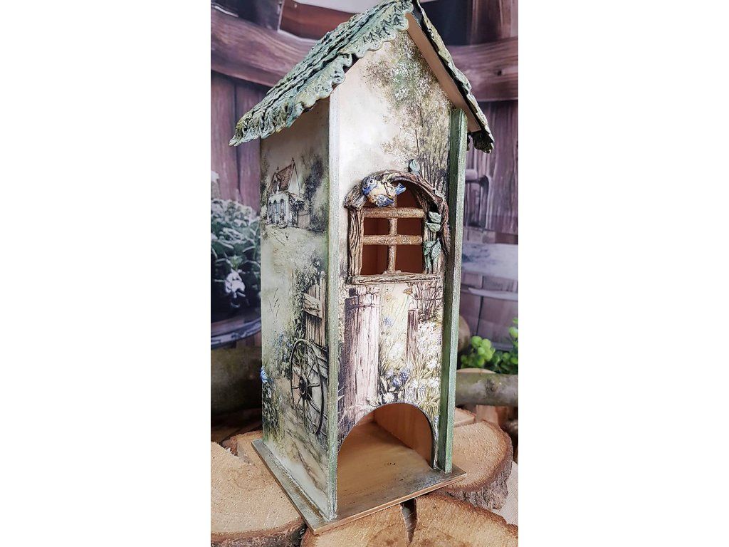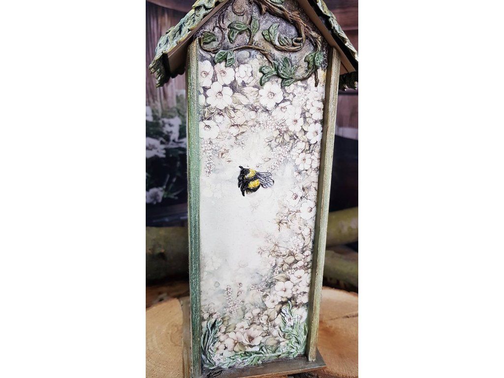 Drevený domček (zásobník) na čaj s odnímateľnou strechou... kombinácia ryžového papiera a maľby s drobnými modelovanými doplnkami ako čmeliak, kvietky, listy... :)