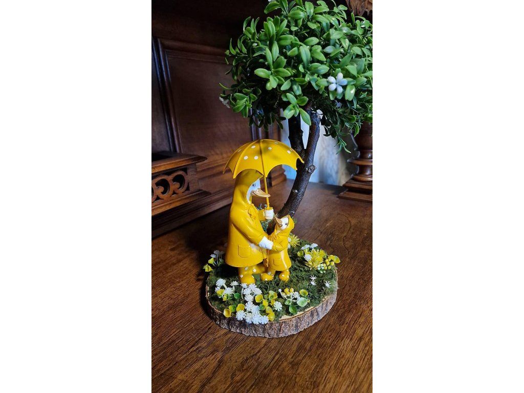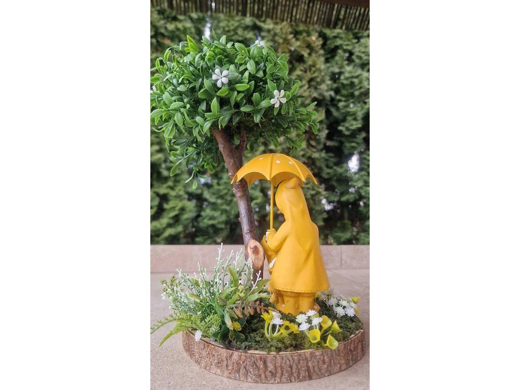 KAČIČKY z POLYRESINU, DÁŽDNIK je kovový (pevne uchytený), DREVENÉ KOLIESKO, rozmanitý umelý materiál v kombinácii s prírodným.