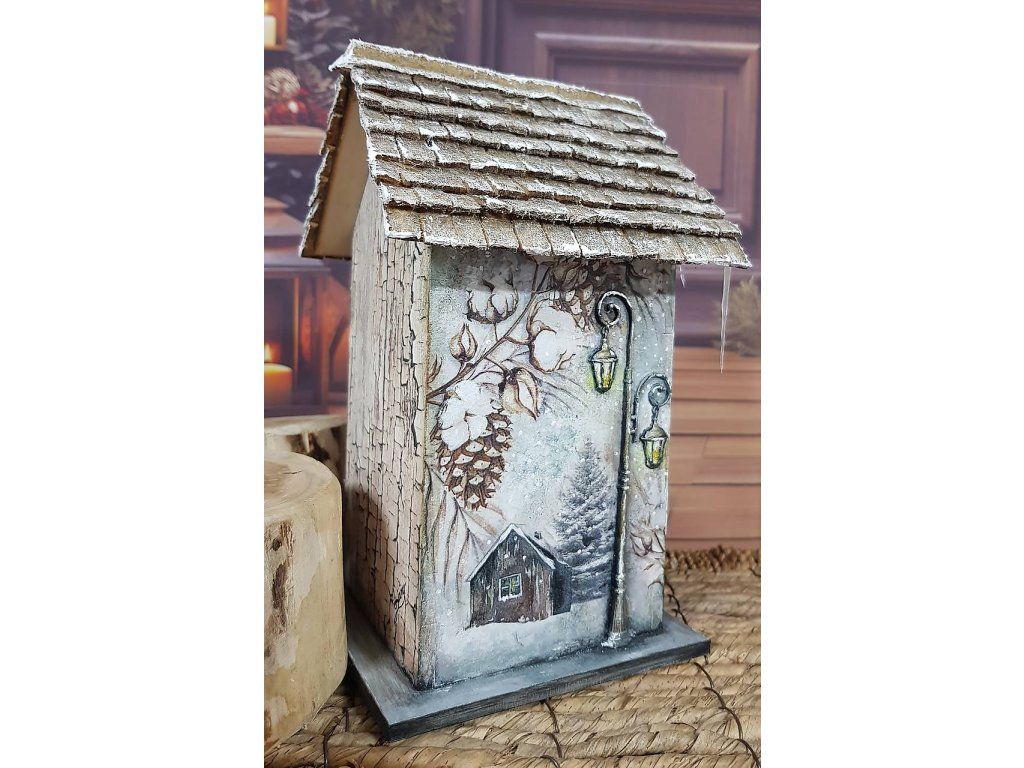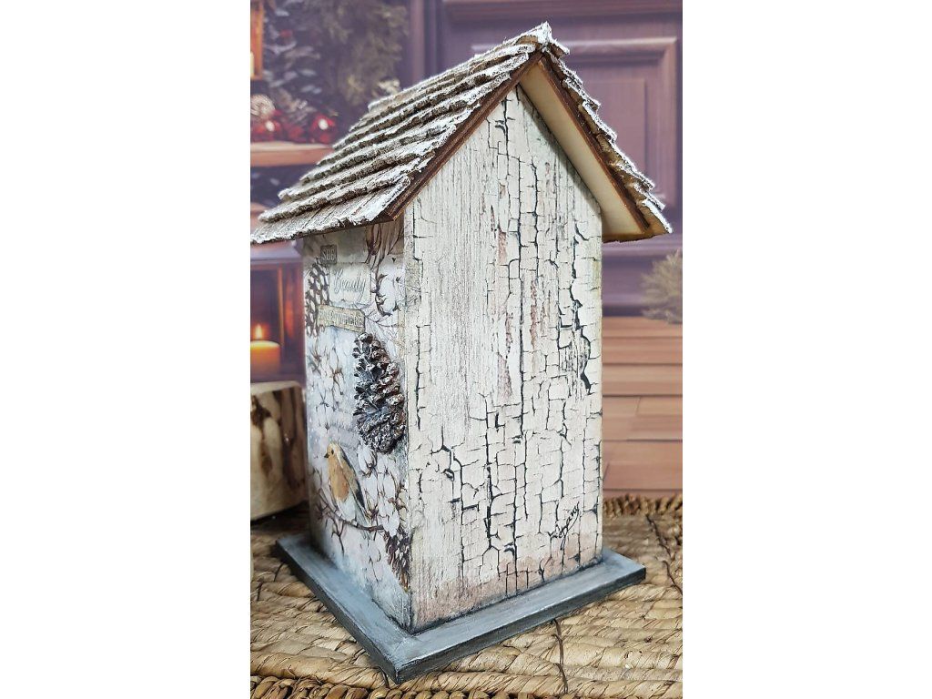Drevený domček (zásobník) na čaj s odnímateľnou strechou, zdobený servítkovou technikou v kombinácii s maľbou... drobnými odliatkami.