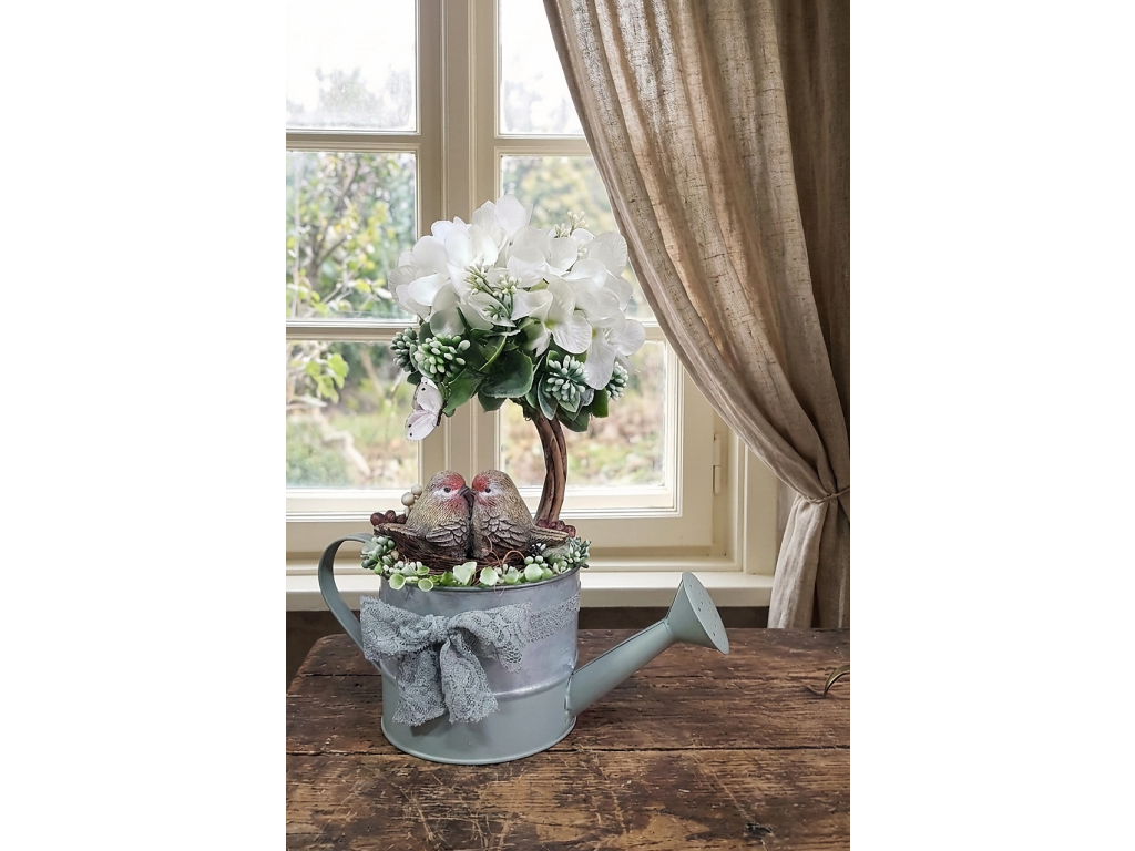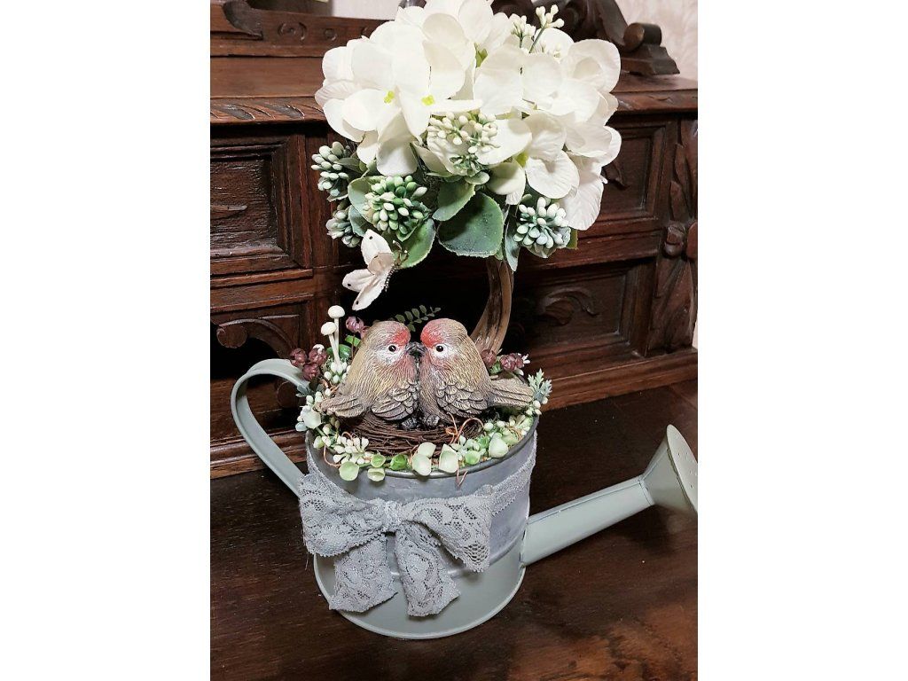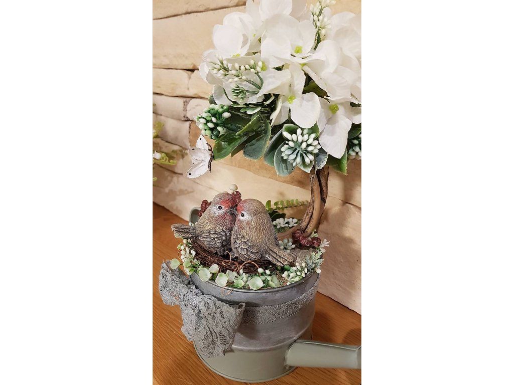 Do prúteného hniezdočka sú posadené milé vtáčence a aranžované do kovovej mini krhličky.